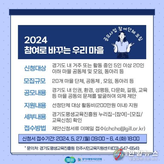 전국연합뉴스 조민준 기자 | 경기도가 ‘2024년 참여로 바꾸는 우리마을 사업’의 참여단체를 6월 4일까지 모집한다. 참여로 바꾸는 우리마을은 마을의 문제를 주민이 참여해 해결하는 과정에서 마을 민주주의를 실현하는 사업이다.