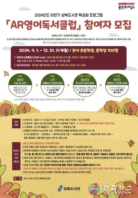 전국연합뉴스 배주현 기자 | 용인특례시 성복도서관은 2024년 하반기 ‘AR(Accelerated Reader)영어독서클럽’에 참여할 초·중학생 100명을 모집한다고 9일 밝혔다.
