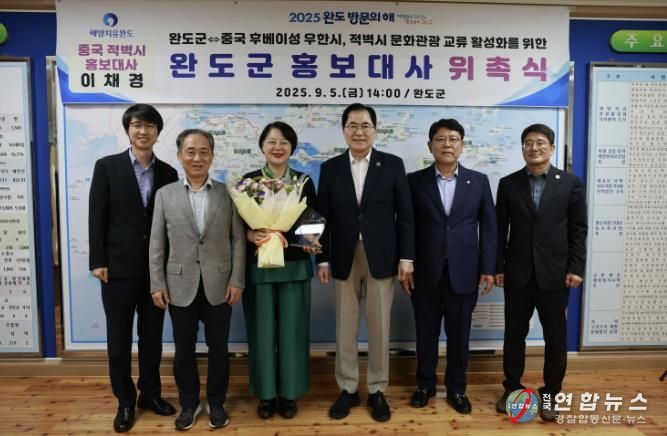 전국연합뉴스 김철환 기자 | 완도군은 지난 9월 5일 중국 후베이성 우한시·적벽시와 문화 관광 교류 활성화를 위해 이채경 중국 후베이성 적벽시의 홍보 대사를 군 홍보 대사로 위촉했다.
