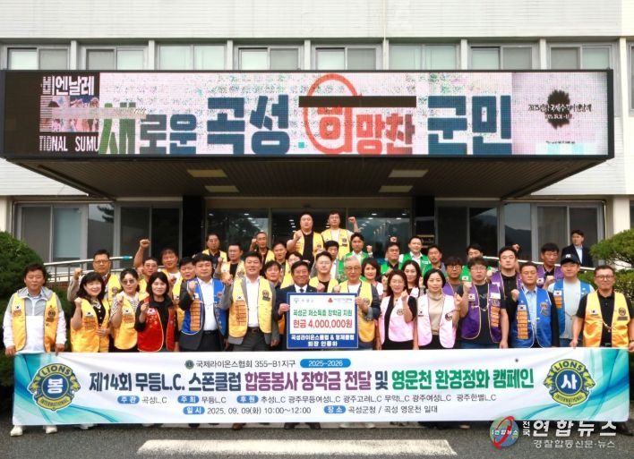 전국연합뉴스 김철환 기자 | 곡성군은 곡성라이온스클럽(회장 안종하)과 7개 형제클럽(추성라이온스·광주무등여성라이온스·광주고려라이온스·무악라이온스·광주여성라이온스·광주한별라이온스·무등라이온스)의 회원들이 뜻을 모아 곡성군 지정 전남사회복지공동모금회에 4백만 원을 기부했다고 9일 전했다.