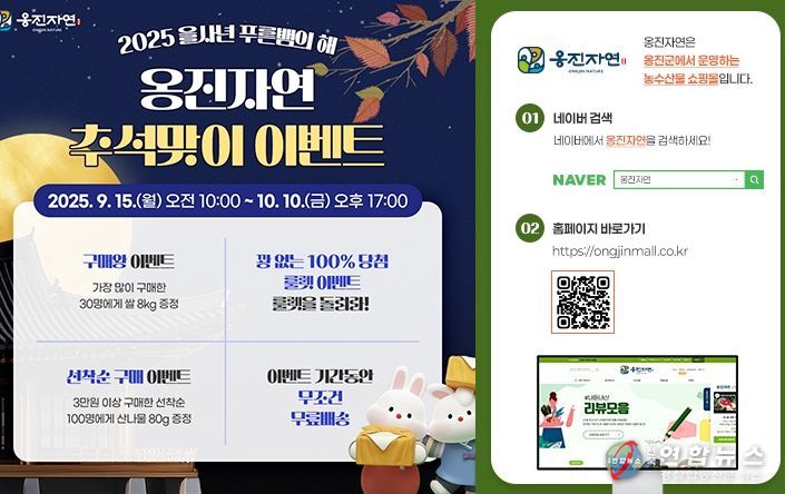 이번 행사는 옹진군 공식 쇼핑몰‘옹진자연’과 우체국 쇼핑몰‘옹진브랜드관’에서 각각 운영되며, 기간과 혜택이 다양하게 구성되어 소비자들에게 풍성한 명절 혜택을 제공할 예정이다.