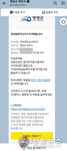 전국연합뉴스 김철환 기자 | 영광군은 지난 8월 5일에 이어 오는 9월 11일, 지방세 납부 기한을 넘긴 체납자를 대상으로 **'카카오 알림톡'**을 활용한 모바일 전자고지 2차 전송을 시행한다고 밝혔다.