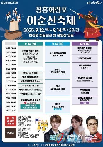전국연합뉴스 김철환 기자 | 장흥군은 9월 12일부터 14일까지 3일간, 장흥군 회진면 회령진성 및 회진항 물양장 일원에서 2025 장흥 회령포 이순신 축제를 개최한다고 밝혔다.