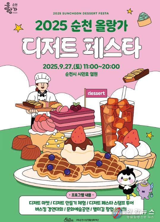 전국연합뉴스 김철환 기자 | 순천시는 오는 27일 오전 11시부터 오후 8시까지 시민로 일원에서 원도심 상권 활성화를 위한 특화 테마 축제 '2025 순천 올랑가 디저트 페스타'를 개최한다고 밝혔다.