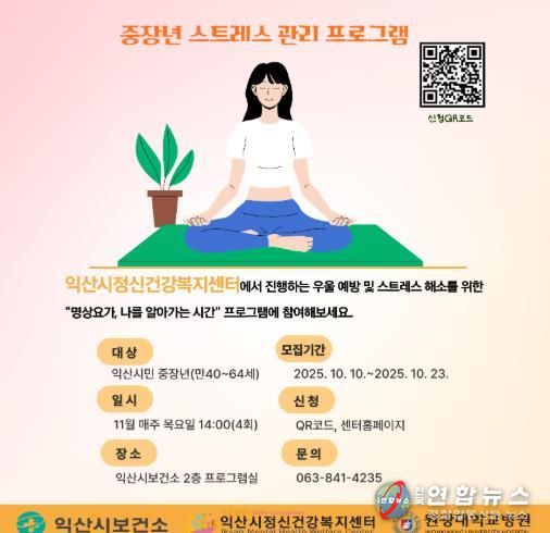 전국연합뉴스 최성용 기자 | 익산시정신건강복지센터는 만 40~64세 중장년을 대상으로 '마음힐링 명상요가' 프로그램을 운영한다고 10일 밝혔다.