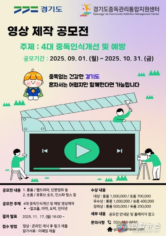 전국연합뉴스 조민준 기자 | 경기도와 경기도중독관리통합지원센터가 ‘2025년 중독예방 영상 공모전’을 개최한다. 이번 공모전은 전 도민을 대상으로 알코올, 마약, 도박, 인터넷 4대 중독에 대한 위험성과 경각심을 높이고 예방 문화를 확산하기 위해 마련됐다.
