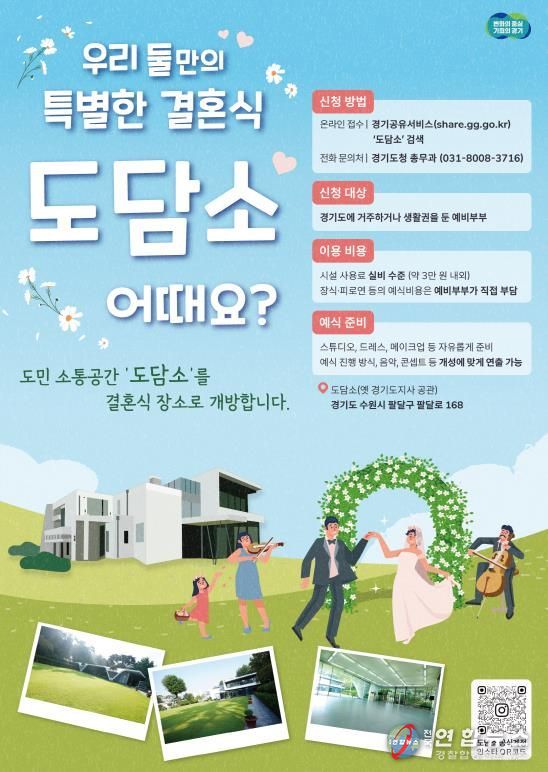 전국연합뉴스 조민준 기자 | 도민 소통공간인 ‘도담소’를 작은결혼식 공간으로 개방한 경기도가 1호 예비부부를 모집한다고 13일 밝혔다.