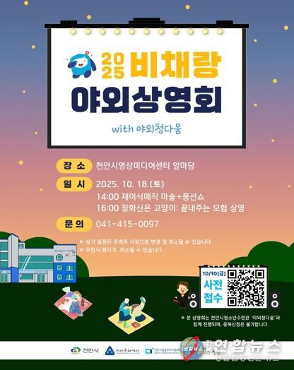 전국연합뉴스 김대환 기자 | 천안문화재단은 오는 18일 천안시영상미디어센터에서 ‘2025 비채랑 야외상영회’를 운영한다고 13일 밝혔다.