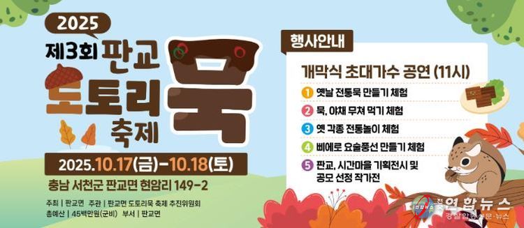 전국연합뉴스 김대환 기자 | 서천군 판교면은 오는 10월 17일부터 이틀간 판교전통시장 일원에서 ‘제3회 판교 도토리묵 축제’를 연다.