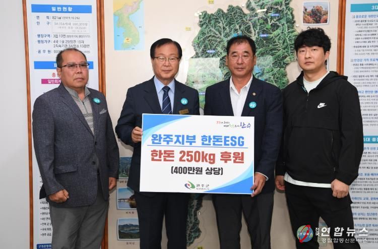 전국연합뉴스 최성용 기자 | (사)대한한돈협회 완주지부가 완주군에 400만 원 상당의 돼지고기 전지 250kg를 전달했다.