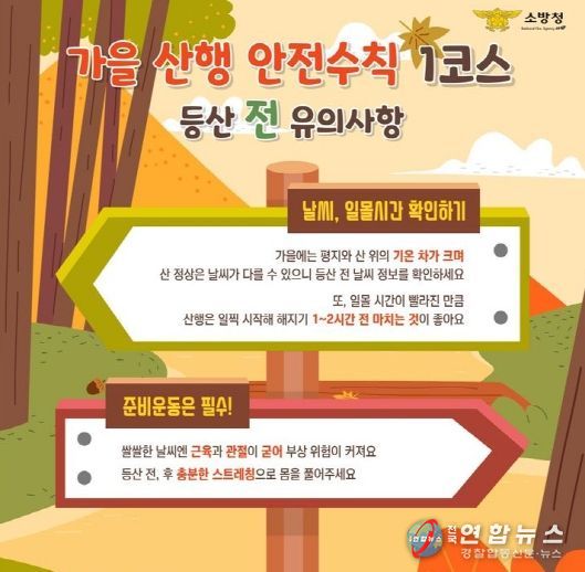 전국연합뉴스 김대환 기자 | 천안서북소방서는 본격적인 가을 산행철을 맞아 시민들에게 안전한 산행을 위한 ‘가을 산행 안전수칙’을 지켜줄 것을 당부했다.