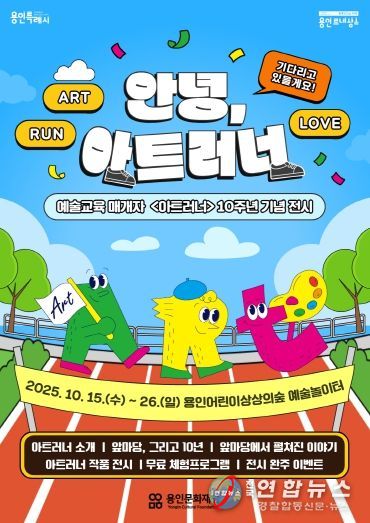전국연합뉴스 박남호 기자 | (재)용인문화재단은 예술교육 매개자 ‘아트러너(Art Runner)’ 사업 10주년을 맞아 오는 10월 15일부터 26일까지 용인어린이상상의숲 예술놀이터에서 기념 전시 '안녕, 아트러너'를 개최한다.