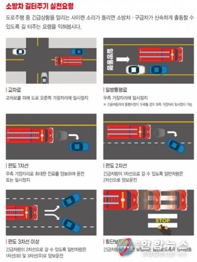 소방서는 도로 주행 중 긴급차량의 사이렌이 들릴 경우, 운전자가 즉시 도로 가장자리로 이동하거나 일시 정지해야 한다며 교차로, 일방통행로, 편도 도로 등 상황별 올바른 대처 요령을 안내했다.
