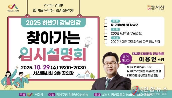 전국연합뉴스 김용태 기자 | 충남 서산시가 오는 29일 오후 7시 서산문화원 3층 공연장에서 ‘강남인강 찾아가는 입시설명회’를 개최한다고 밝혔다.