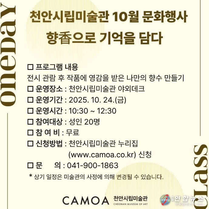 전국연합뉴스 김대환 기자 | 천안시립미술관은 오는 24일 문화행사 ‘향香으로 기억을 담다’를 진행한다고 21일 밝혔다.