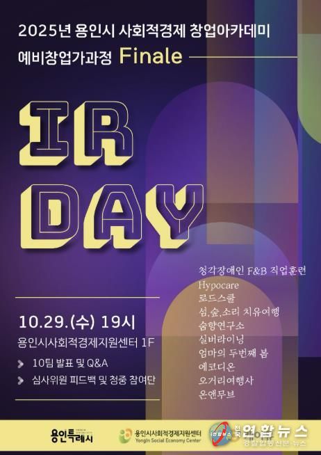 전국연합뉴스 박남호 기자 | 용인특례시는 오는 29일 열리는 ‘사회적경제 창업아카데미 파이널 IR 데모데이’에 참가할 ‘청중평가단’을 모집한다고 22일 밝혔다.