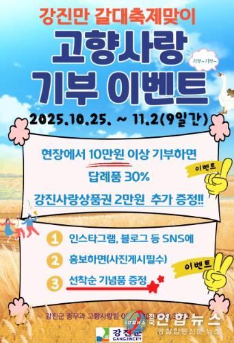전국연합뉴스 김철환 기자 | 강진군이 오는 25일부터 11월 2일까지 제10회 강진만 춤추는 갈대축제가 열리는 강진만생태공원 전용부스에서 강진 고향사랑기부제 이벤트를 진행한다.
