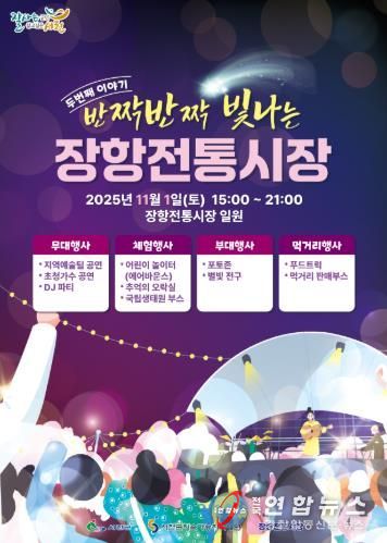 장항전통시장의 활성화를 위해 진행하는 이번 행사는 11월 1일 토요일 오후 3시부터 밤 9시까지 진행되며 ▲문화공연 ▲DJ 파티 ▲경품추첨 ▲어린이 놀이터(에어바운스, 오락실) ▲만들기 체험 ▲행운의 뽑기 등 다양한 프로그램으로 구성되어 있다.