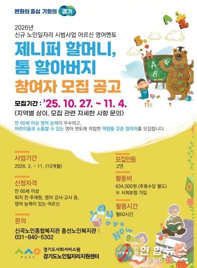 전국연합뉴스 박점규 기자 | 의정부시는 2026년도 노인일자리 시범사업으로 추진되는 어르신 영어 멘토 프로그램 ‘제니퍼 할머니, 톰 할아버지’ 사업 참여자를 모집한다.