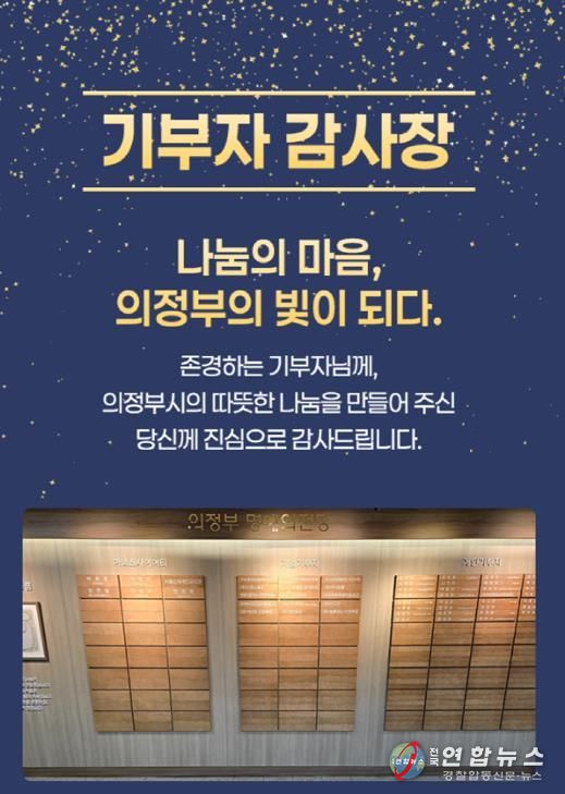 전국연합뉴스 박점규 기자 | 의정부시는 11월 4일 ‘기부자 명예의 전당’에 등재된 52명의 기부자에게 모바일 감사장을 발송하며, 지역 발전과 나눔 문화 확산에 기여한 귀한 뜻에 깊은 감사를 전했다.