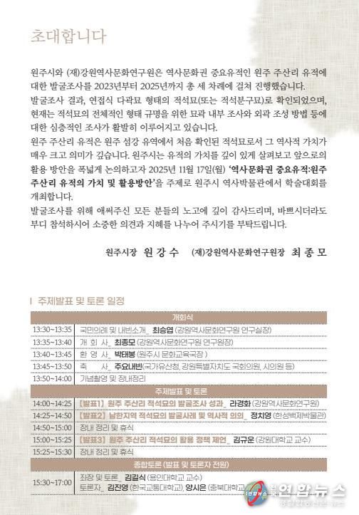 전국연합뉴스 유근택 기자 | 원주시역사박물관과 강원역사문화연구원은 오는 17일 오후 1시부터 5시까지 박물관 1층 강당에서, 섬강 횡성지구 하천환경정비사업 구간에서 발견된 유적의 발굴 성과를 공유하는 학술대회를 개최한다.