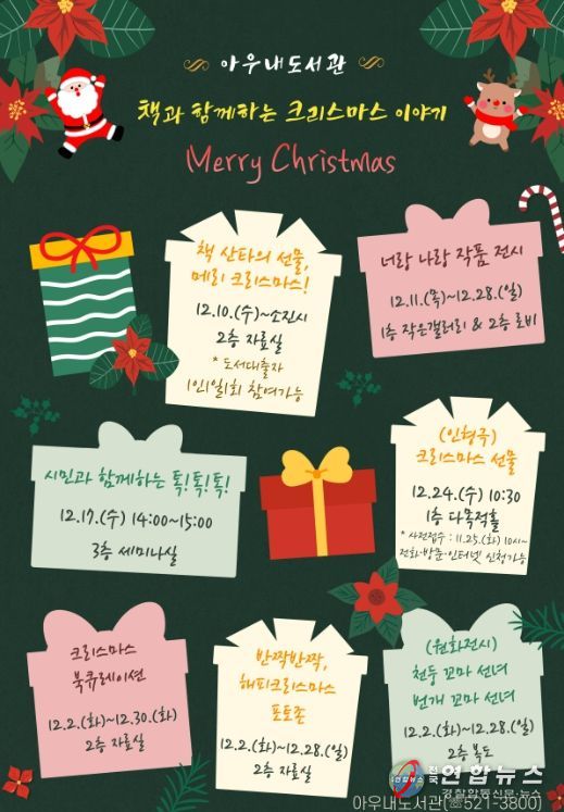 전국연합뉴스 김대환 기자 | 천안시 아우내도서관은 연말을 맞아 내달 다채로운 크리스마스 행사를 운영한다고 25일 밝혔다.
