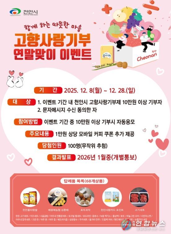 전국연합뉴스 김대환 기자 | 천안시는 오는 28일까지 ‘고향사랑기부제 연말맞이 이벤트’를 진행한다고 8일 밝혔다.