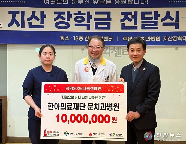 전국연합뉴스 김대환 기자 | (재)천안시복지재단은 지난 22일 한아의료재단 문치과병원이 학업장려금 3,000만 원을 기탁했다고 밝혔다.