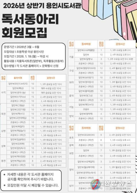 전국연합뉴스 박남호 기자 | 용인특례시는 상반기 독서동아리 회원 409명을 모집한다고 6일 밝혔다.