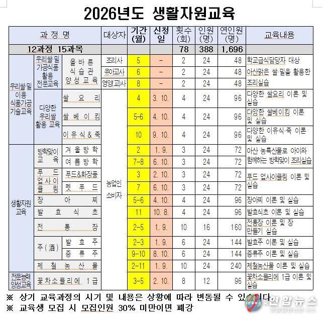 이미용 농촌자원과장은 “올해 생활자원교육은 단순한 실습을 넘어 시민의 삶에 실질적인 도움이 되는 교육이 되도록 계획했다”며, “다양한 교육과정을 통해 많은 시민들이 농촌자원의 가치를 체감하길 바란다”고 말했다.