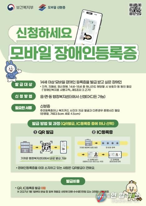 이유진 장애인복지과장은 “모바일 장애인등록증 도입으로 장애인의 행정 서비스 접근성이 한층 향상될 것으로 기대된다”며 “디지털 기술을 통해 장애인의 생활 편의를 실질적으로 개선할 수 있도록 제도가 안정적으로 정착되도록 최선을 다하겠다”고 말했다.