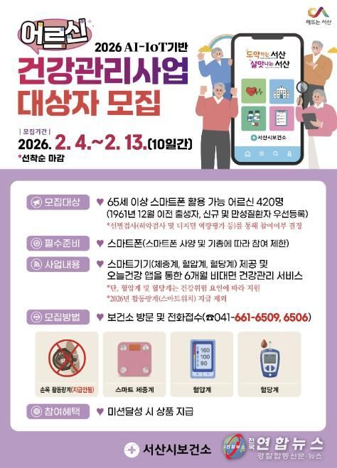 전국연합뉴스 김용태 기자 | 충남 서산시가 인공지능(AI)·사물인터넷(IOT) 기반 어르신 건강관리사업의 대상자를 모집한다고 밝혔다.