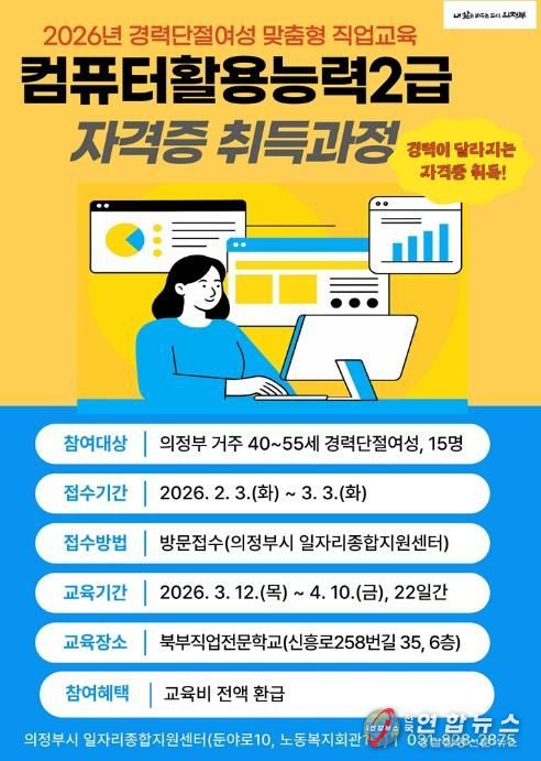 전국연합뉴스 박점규 기자 | 의정부시는 경력단절여성의 취업역량 강화를 위해 2월 3일부터 3월 3일까지 ‘컴퓨터활용능력2급 자격증 취득과정’ 참여자를 모집한다.