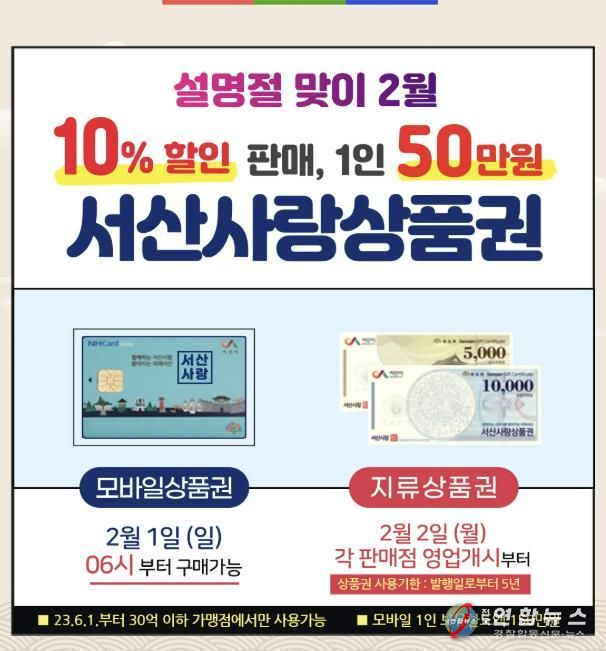 시는 2월 한시적으로 서산사랑상품권 1인당 구매 한도액을 기존 40만 원에서 50만 원으로 상향하고, 할인율은 기존과 동일한 10%를 적용한다.