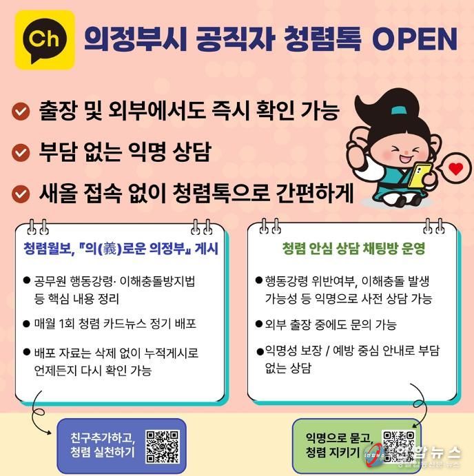 전국연합뉴스 박점규 기자 | 의정부시는 2026년 1월부터 카카오톡 비즈니스 공식 채널을 활용한 ‘의정부시 공직자 청렴톡’을 운영한다.