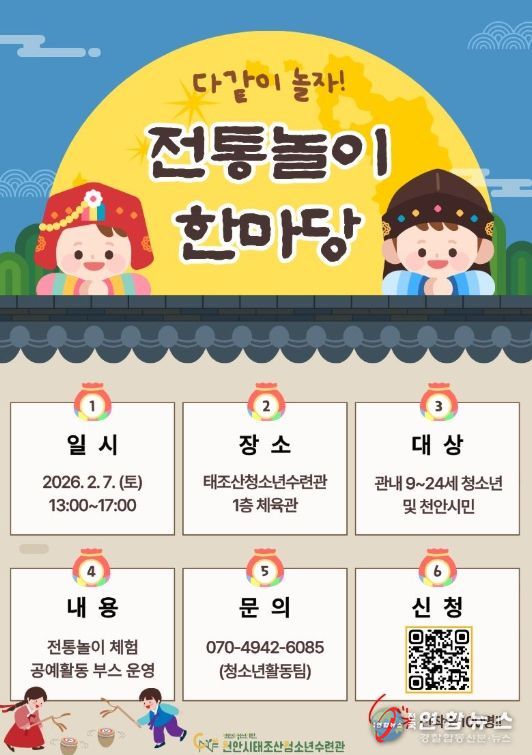 전국연합뉴스 김대환 기자 | (재)천안시청소년재단 천안시태조산청소년수련관은 설 명절을 맞아 오는 2월 7일 수련관 체육관에서 ‘전통놀이 한마당’을 운영한다고 30일 밝혔다.