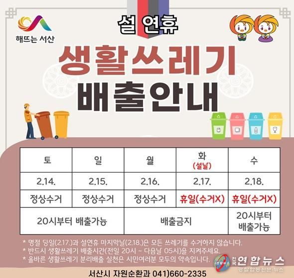 전국연합뉴스 김용태 기자 | 충남 서산시는 설 명절을 맞아 귀성객과 시민들이 쾌적하게 명절을 보낼 수 있도록 “설 명절 쓰레기 관리 대책”을 2월 2일부터 18일까지 추진한다고 밝혔다.