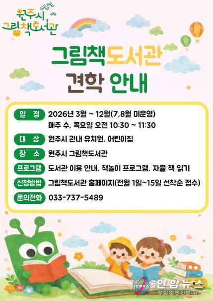 전국연합뉴스 유근택 기자 | 원주시 그림책도서관은 오는 3월부터 12월까지 관내 유치원과 어린이집을 대상으로 어린이 견학 프로그램을 운영한다.