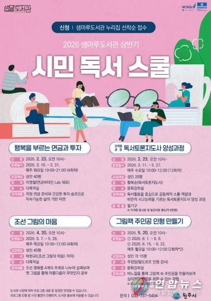전국연합뉴스 유근택 기자 | 원주시 샘마루도서관은 시민들의 독서문화 향유 기회를 확대하기 위해 오는 3월부터 6월까지 ‘상반기 시민 독서 스쿨’ 프로그램을 운영한다.
