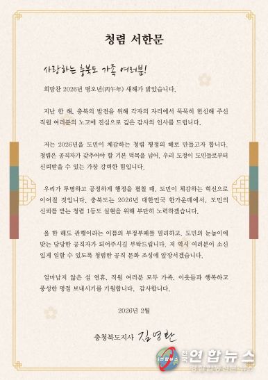 전국연합뉴스 이동수 기자 | 김영환 충북도지사가 2026년 병오년(丙午年)을 ‘도민이 체감하는 청렴 행정의 해’로 만들겠다는 의지를 담은 청렴서한문을 전 직원에게 발송하고, 올 한 해 청렴 실천을 당부했다.