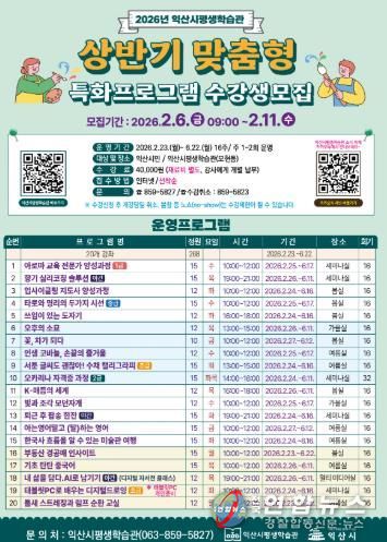 익산시는 오는 6일부터 익산시평생학습관에서 '2026년 상반기 맞춤형 특화프로그램' 수강생을 선착순으로 모집한다고 3일 밝혔다.