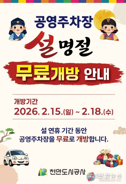 전국연합뉴스 김대환 기자 | 천안도시공사는 설 연휴기간 공영주차장을 무료로 개방한다고 5일 밝혔다.