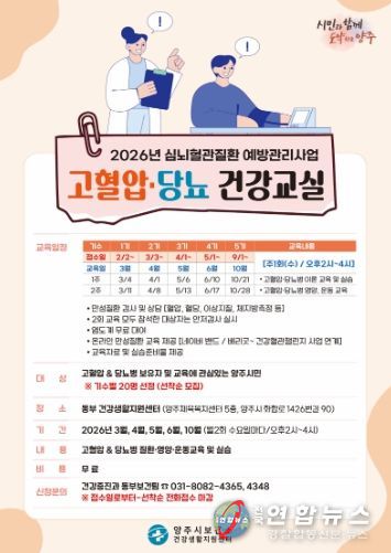 전국연합뉴스 박점규 기자 | 양주시보건소 동부 건강생활지원센터에서는 시민의 심뇌혈관질환 예방과 만성질환 관리를 위해 '2026년 고혈압·당뇨병 건강교실'을 운영한다.