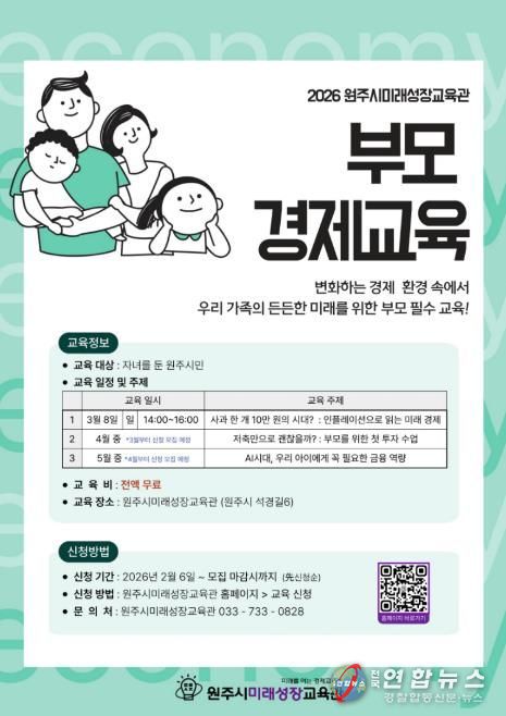 전국연합뉴스 유근택 기자 | 원주시미래성장교육관은 시민들에게 맞춤형 경제 지식을 제공하기 위해 부모와 신중년을 대상으로 ‘3월 맞춤형 경제교육’을 운영한다.