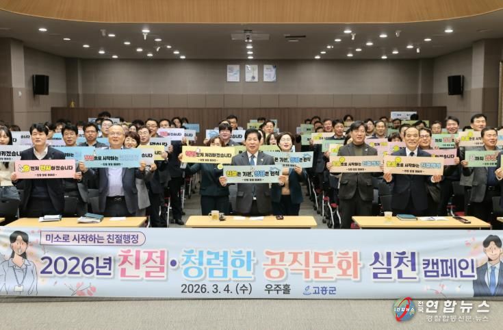 전국연합뉴스 김철환 기자 | 고흥군은 4일 친절하고 청렴한 공직문화 조성을 위해 전 직원을 대상으로 ‘친절·청렴 실천 캠페인’을 실시했다고 밝혔다.