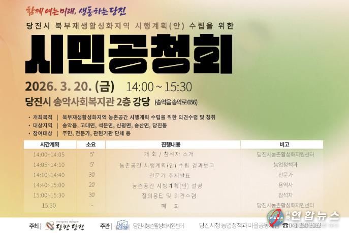전국연합뉴스 김용태 기자 | 당진시는 오는 20일 오후 2시 송악사회복지관(송악읍 송악로 656)에서 북부농촌재생활성화지역*을 대상으로 수립한‘농촌 공간 재구조화 및 재생 시행계획(안)’에 대한 공청회를 개최한다고 6일 밝혔다.