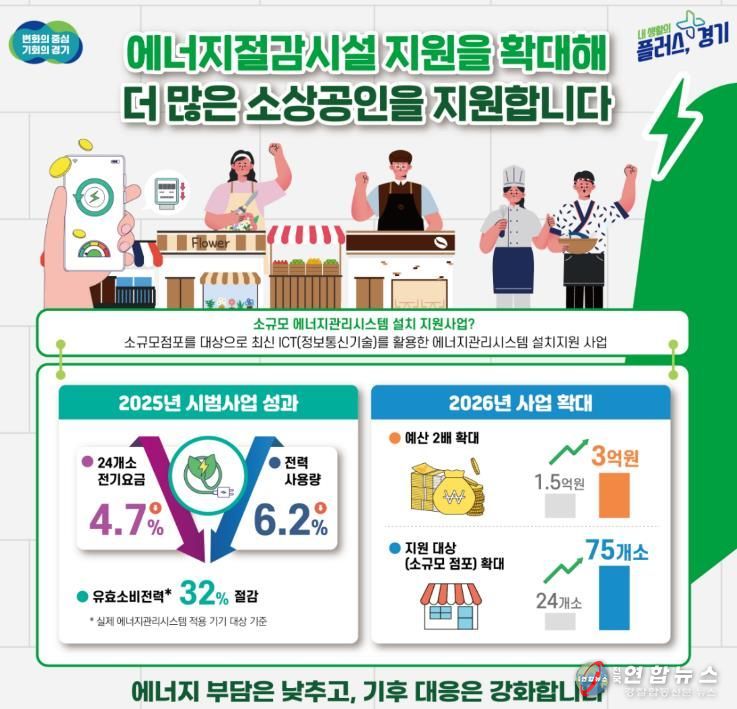 차성수 경기도 기후환경에너지국장은 “2025년 시범사업에서 전기요금 절감 효과가 객관적으로 입증된 만큼 2026년에는 보다 많은 소상공인이 혜택을 받을 수 있도록 사업을 확대 추진한다”며 “에너지 효율 향상을 통해 소상공인의 경쟁력을 높이고, 기후위기 대응에도 앞장서겠다”고 말했다.