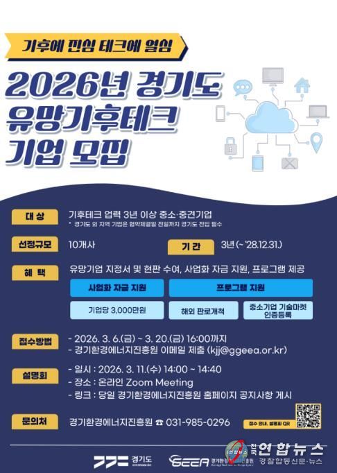 전국연합뉴스 조민준 기자 | 경기도와 경기환경에너지진흥원이 기후위기 대응을 선도할 혁신 기술 보유 기업을 발굴하기 위해 오는 3월 20일까지 ‘2026년 경기도 유망 기후테크 기업’ 10곳을 모집한다.