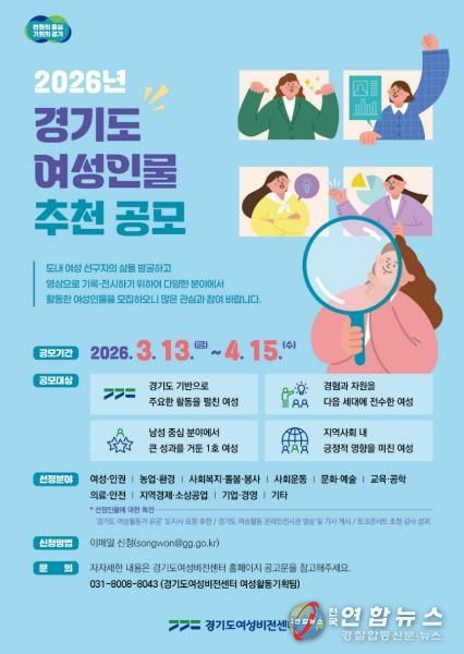 전국연합뉴스 조민준 기자 | 경기도여성비전센터는 4월 15일까지 ‘2026년 경기도 여성인물’을 모집하고, 선정된 4명의 활동 영상을 전시한다고 13일 밝혔다.