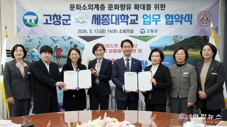 전국연합뉴스 최성용 기자 | 고창군은 지난 13일 세종대학교(총장 엄종화)와 지역 내 문화소외계층의 문화접근성 향상과 문화향유 기회 확대를 위해 업무협약을 체결했다.